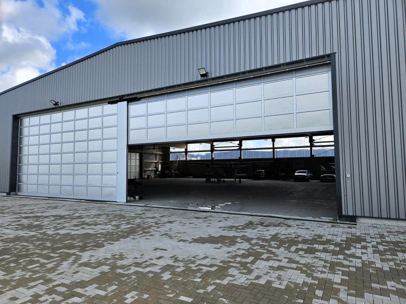 Sektionaltore mit verfahrbaren Mittelstützen bieten die Chance Hallenöffnungen von über 20 m Breite flexibel zu schließen. Mit elektrischer Bedienung und Funk kann das Tor dann auch vom Cockpit aus geöffnet werden.